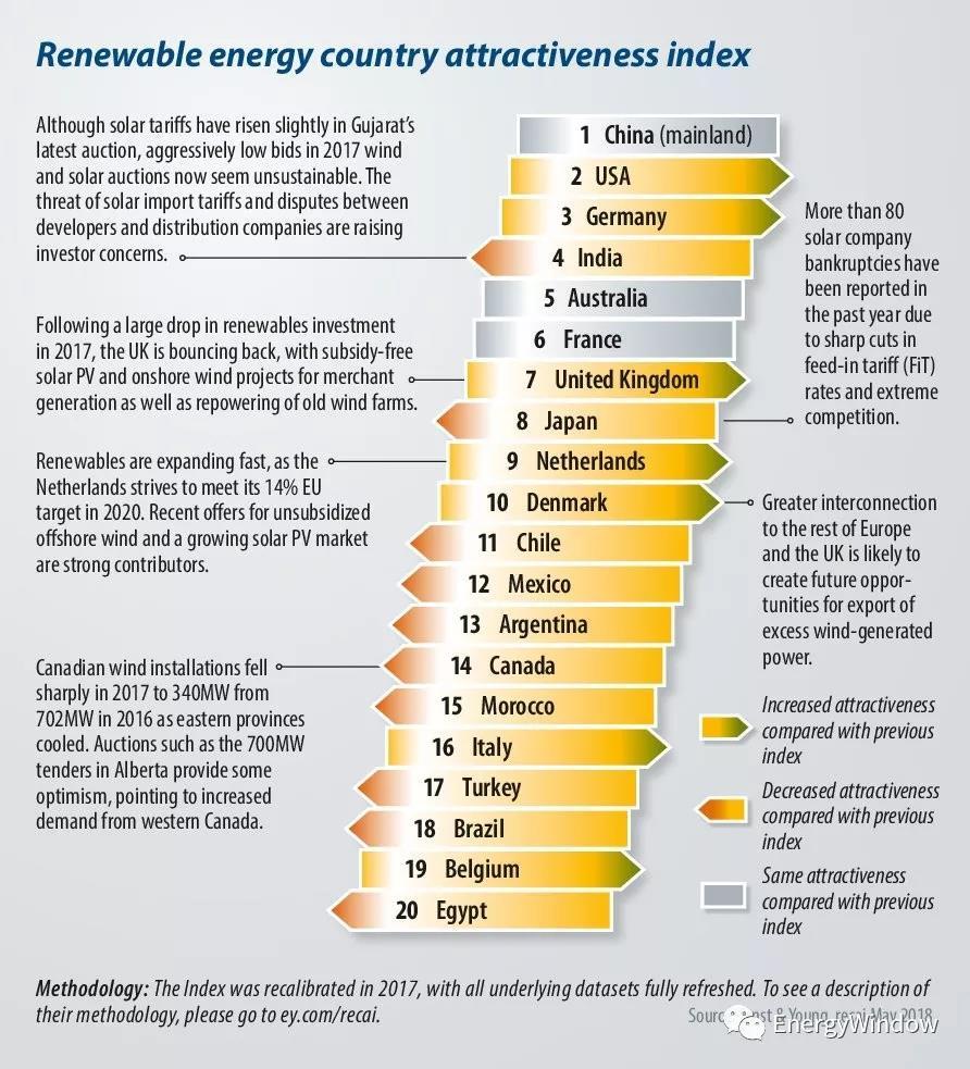 英國(guó)光伏就從此一蹶不振了么?似乎恰恰相反,英國(guó)光伏行業(yè)即將迎來(lái)發(fā)展的新機(jī)遇。根據(jù)安永發(fā)布的可再生能源國(guó)家吸引力指數(shù)報(bào)告,英國(guó)排名第7,高于2017年和2016年的第10和13位。