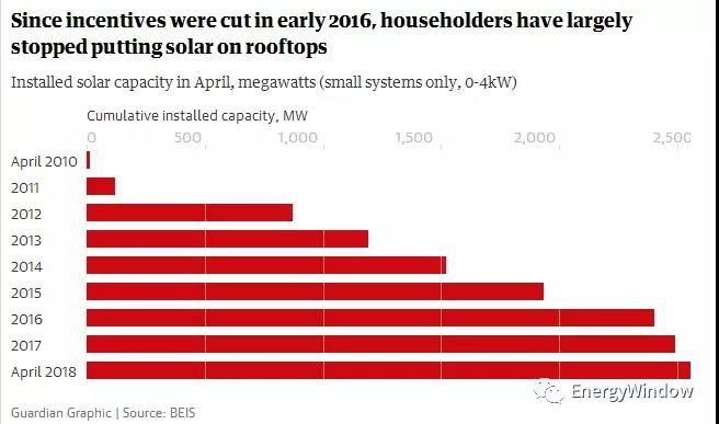 一時(shí)之間,曾經(jīng)是歐洲光伏裝機(jī)增長(zhǎng)最快的英國(guó),遭遇光伏大滑坡。2016年前兩月英國(guó)光伏裝機(jī)21MW,去年同期則是81MW。2018年,英國(guó)預(yù)計(jì)光伏裝機(jī)14MW,2011年的新增裝機(jī)則是606MW。