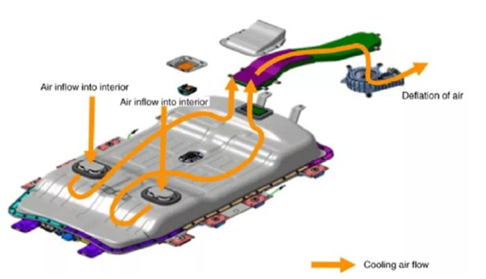 在被動(dòng)式冷卻中空氣冷卻應(yīng)用最為廣泛,所謂空氣冷卻,顧名思義就是將空氣作為傳熱介質(zhì),直接讓空氣穿過(guò)電池模塊以達(dá)到冷卻的目的。此外,空氣自然冷卻效率較低,因此電動(dòng)汽車大多使用強(qiáng)制空氣冷卻,電池的熱量經(jīng)過(guò)排風(fēng)風(fēng)扇強(qiáng)制帶走。