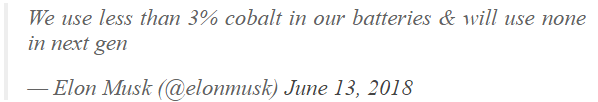 6月早些時候,松下宣布正在開發(fā)無鈷電動汽車電池。作為全球最大的汽車鋰離子電池單元制造商、以及為特斯拉Model 3、Model S、和Model X提供電池的獨家供應商,松下這則消息的宣布有著極為重要的意義。即使在今天,特斯拉的鈷用量對于特斯拉電池的組成也不再是那么的重要。特斯拉和松下在降低鈷使用率方面顯然領先于其他電動汽車生產(chǎn)商。特斯拉長期以來一直是由日本松下開發(fā)的鎳鈷鋰(NCA)電池技術的擁護者與倡導者,這與鎳鈷錳(NCM)電動汽車電池的發(fā)展趨勢背道而馳。但馬斯克依然不斷的在重申,物質發(fā)展世界的趨勢是朝著更高能量、更低鈷含量的鈷化學品的方向發(fā)展。