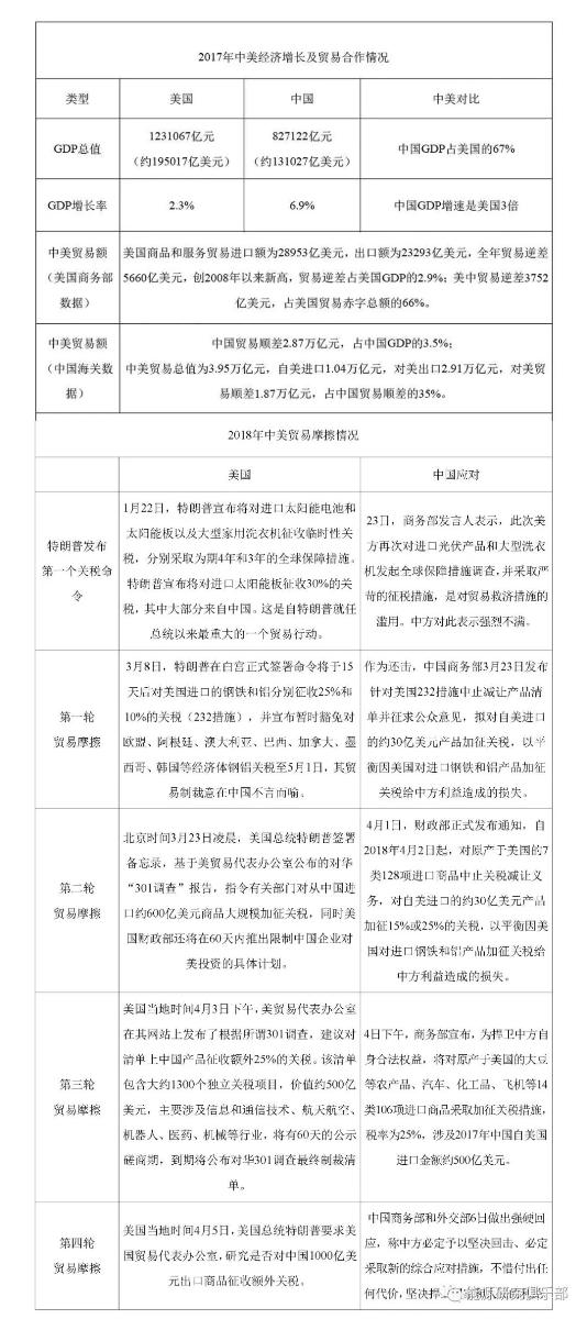 表1 2017~2018年中美經(jīng)濟(jì)情況及貿(mào)易摩擦情況