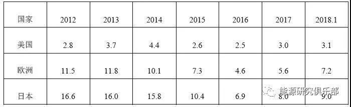 在天然氣價(jià)格方面,自從“頁(yè)巖革命”爆發(fā)以來,美國(guó)頁(yè)巖氣生產(chǎn)爆發(fā)式增長(zhǎng),使得美國(guó)迅速成為全球天然氣價(jià)格的洼地;東亞天然氣消費(fèi)者則不得不承受國(guó)際天然氣市場(chǎng)長(zhǎng)期存在的“東亞溢價(jià)”的負(fù)擔(dān),東亞市場(chǎng)天然氣價(jià)格高時(shí)可達(dá)北美市場(chǎng)6倍左右。從2012年至2018年第一季度,歐洲天然氣價(jià)格相當(dāng)于美國(guó)天然氣價(jià)格的1.8~4.1倍,東亞價(jià)格(以日本價(jià)格為基準(zhǔn))相當(dāng)于美國(guó)的2.7~5.9倍,具體見表4。