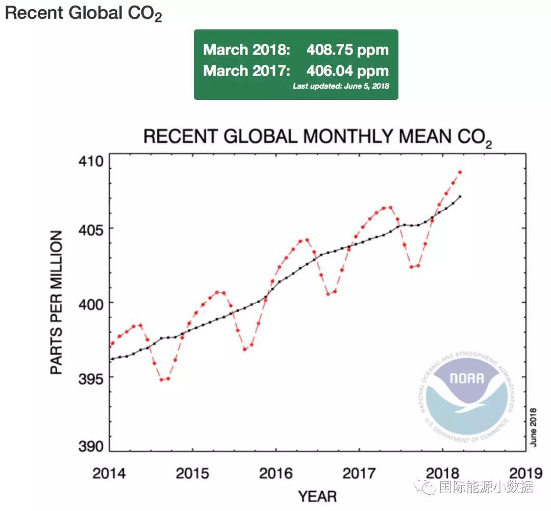 中國(guó)儲(chǔ)能網(wǎng)訊:根據(jù)美國(guó)國(guó)家海洋和大氣管理局(英語(yǔ):National Oceanic and Atmospheric Administration,縮寫(xiě)為NOAA)在夏威夷莫納羅亞(Mauna Loa)天文臺(tái)的觀測(cè),2018年5月份大氣中二氧化碳平均濃度達(dá)到411.25ppm,達(dá)到歷史最高點(diǎn)(去年同期濃度為409.65ppm)。