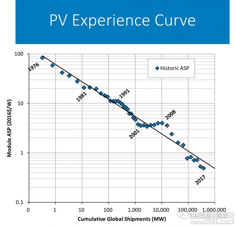 中國(guó)儲(chǔ)能網(wǎng)訊:根據(jù)美國(guó)國(guó)家可再生能源實(shí)驗(yàn)室(NREL)匯總的數(shù)據(jù),編制了1976年至2017年光伏成本的“經(jīng)驗(yàn)曲線(對(duì)數(shù))”,每當(dāng)光伏累計(jì)裝機(jī)加倍,光伏就會(huì)下降大約22%。自2012年以來(lái),光伏組件的實(shí)際價(jià)格已經(jīng)低于經(jīng)驗(yàn)曲線。