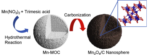 該研究團隊利用溶劑熱反應,合成了自組裝錳基金屬復合物(Mn-MOC),該合成物具有球形結(jié)構(gòu)。然后,研究人員通過熱退火處理將Mn-MOC前體材料轉(zhuǎn)化成分級多孔的Mn3O4/C納米球。