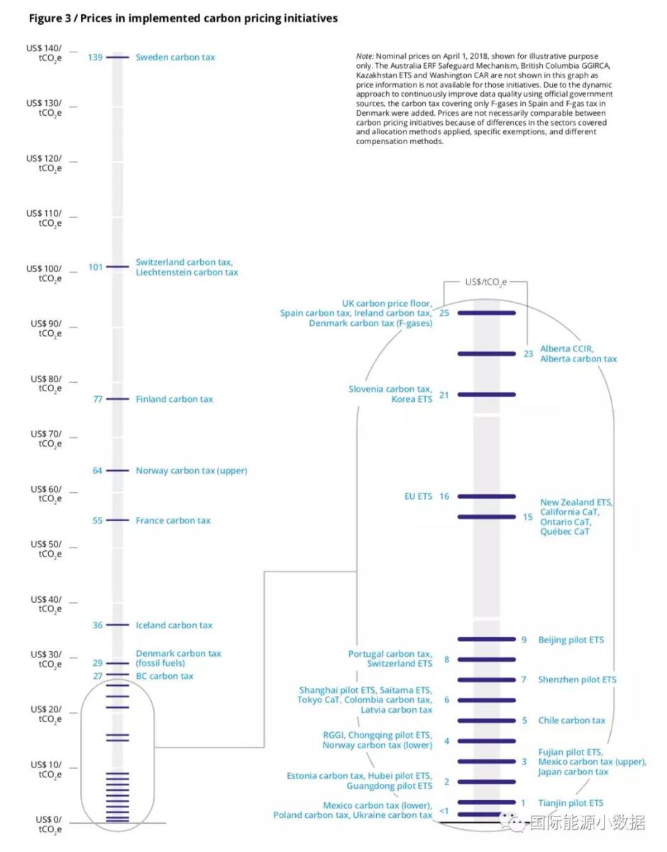 全球范圍內(nèi)碳價(jià)的區(qū)間在低于1美元/噸到139美元/噸之間,總起來說,碳價(jià)較高的國(guó)家均實(shí)施碳稅,而碳價(jià)較低的國(guó)家和地區(qū)則是碳交易市場(chǎng)(碳價(jià)低于10美元/噸的區(qū)域涵蓋46%的碳排放)。碳價(jià)從高到低的國(guó)家和地方如下——