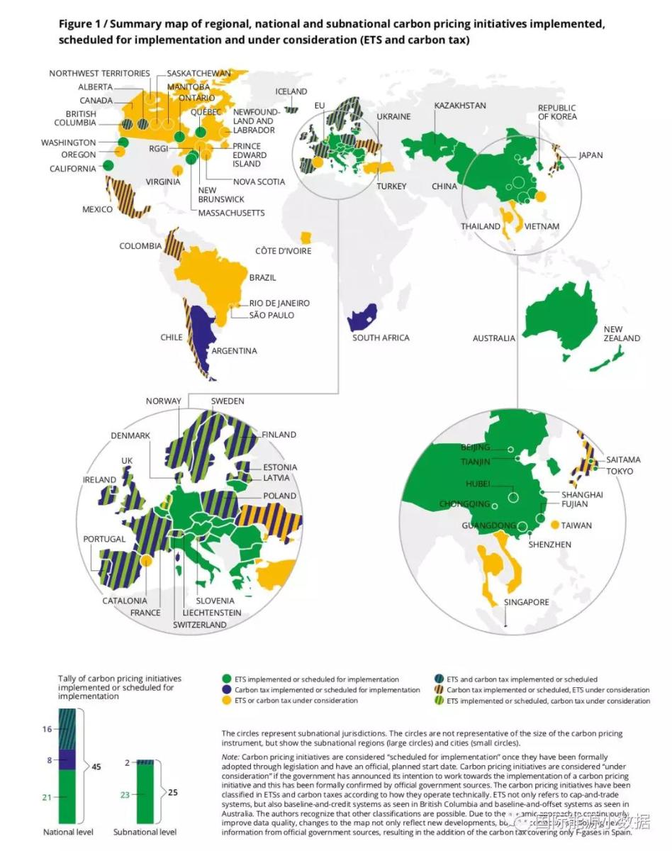 中國(guó)儲(chǔ)能網(wǎng)訊:根據(jù)世界銀行最新發(fā)布的數(shù)據(jù),到目前止已經(jīng)有45個(gè)國(guó)家、25個(gè)國(guó)內(nèi)地方(如州、?。?shí)行了碳價(jià)機(jī)制(碳交易市場(chǎng)或碳稅),涉及110億噸碳排放,占全球碳排放的20%。2017年各國(guó)政府從碳價(jià)機(jī)制中獲得的收益達(dá)到330億美元,比2016年(220億美元)增長(zhǎng)50%。