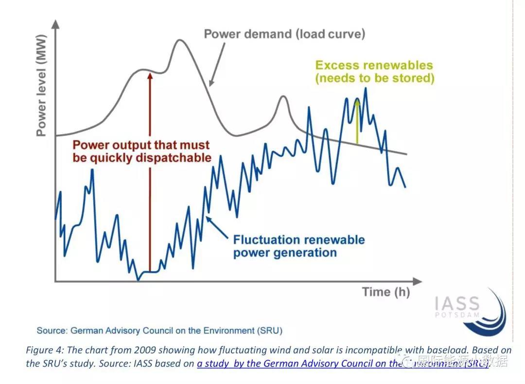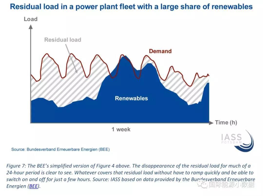 中國(guó)儲(chǔ)能網(wǎng)訊:隨著間歇性可再生能源的比例增加,電網(wǎng)的調(diào)度運(yùn)行需要解決新的問題。如下圖所示,由于可再生能源電源優(yōu)先上網(wǎng),在變動(dòng)的需求負(fù)荷曲線與間歇性可再生電源之間就是“剩余負(fù)荷”(residual load),需要由常規(guī)電廠來滿足。如果可再生能源發(fā)電超出負(fù)荷,那么就需要“棄風(fēng)”、“棄光”或者儲(chǔ)能。