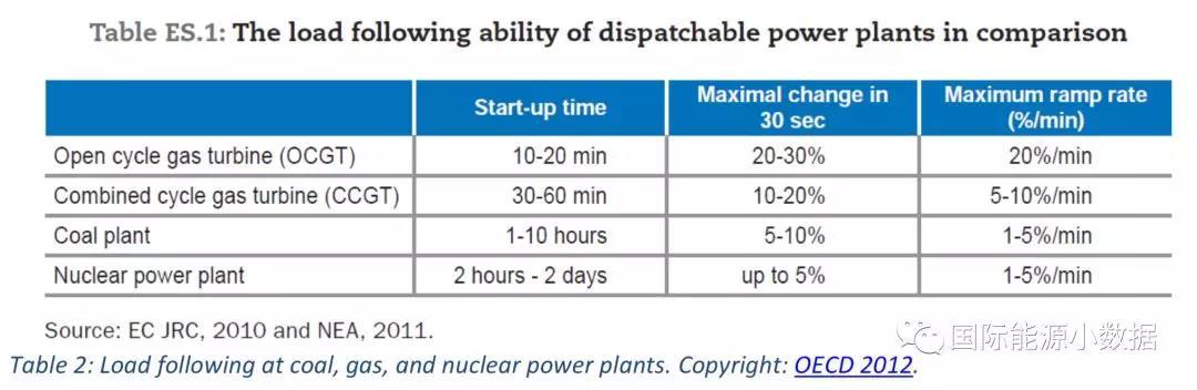 由上表可見,單循環(huán)燃?xì)廨啓C(jī)(OCGT)發(fā)電可在10-20分鐘啟動(dòng),“爬坡率”可達(dá)20%/分鐘;聯(lián)合循環(huán)電廠(CCGT)可在30-60分鐘內(nèi)啟動(dòng),爬坡率為5-10%/分鐘;煤電廠啟動(dòng)時(shí)間要1-10小時(shí),爬坡率1-5%/分鐘;而核電廠啟動(dòng)時(shí)間需要2小時(shí)-2天,爬坡率1-5%/分鐘。