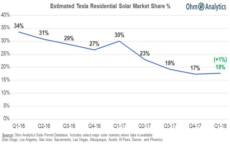 中國儲能網(wǎng)訊:Ohm分析公司的分析報告顯示,繼前幾個季度出現(xiàn)下滑后,2018年一季度,特斯拉的太陽能業(yè)務(wù)市場份額有所增長。