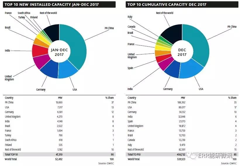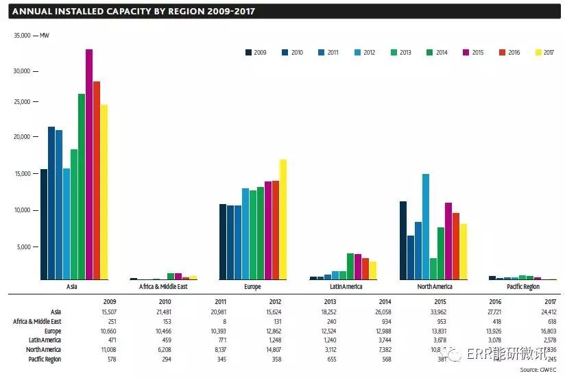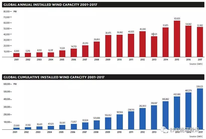 中國儲(chǔ)能網(wǎng)訊:2018年4月25日,全球風(fēng)能理事會(huì)發(fā)布《全球風(fēng)電報(bào)告2017》。17年,全球風(fēng)電新增裝機(jī)容量保持50GW以上,歐洲、印度和離岸部門實(shí)現(xiàn)了歷史性增長。中國新增風(fēng)電裝機(jī)容量有所回落,即19.66GW,為全球新增裝機(jī)容量的不到一半。2017年全球新增裝機(jī)容量為52,492MW,累計(jì)裝機(jī)容量達(dá)到539,123MW。與2016年新增裝機(jī)容量(54,642MW)相比,同比下滑3.8%;累計(jì)裝機(jī)容量與2016年底(487,279MW)相比增長11%。