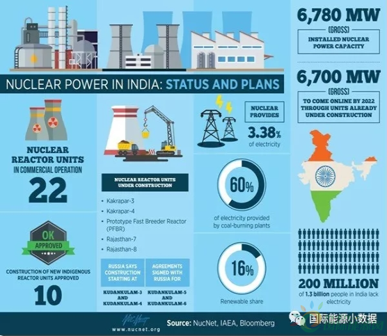 中國儲能網(wǎng)訊:印度目前共有22個核電機組,總裝機容量為6,780兆瓦,發(fā)電量占全國總發(fā)電量的3.38%。目前有6座核電機組在建,預計到2022年增加6,000兆瓦的核電裝機,屆時總裝機為13,480兆瓦。(來源:國際能源小數(shù)據(jù))