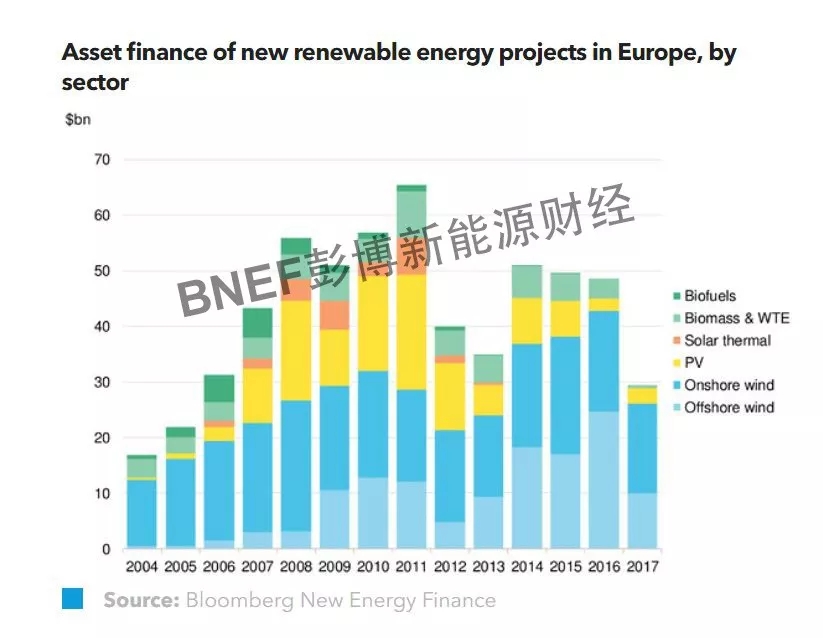 2017年,機(jī)構(gòu)投資者對歐洲可再生能源項(xiàng)目的投資達(dá)到創(chuàng)紀(jì)錄的99億美元,高于2016年的70億美元。最近的一項(xiàng)創(chuàng)新出現(xiàn)在Walney項(xiàng)目擴(kuò)張中,在本次的再融資交易中使用到了通貨膨脹保值債券(CPI-linked bonds)。