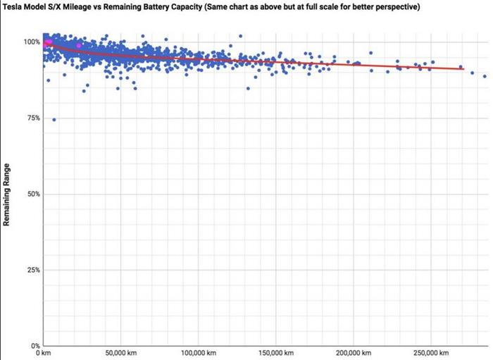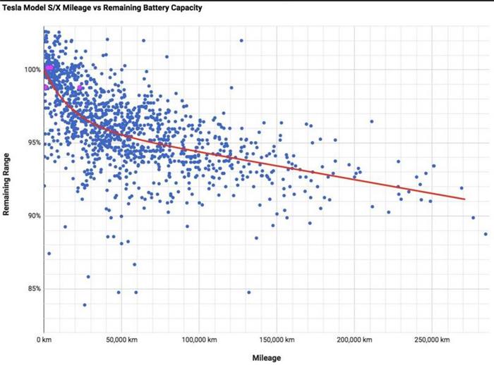 特斯拉論壇內(nèi)的一群車主正從全球350多輛特斯拉汽車處采集相關的數(shù)據(jù),并將其研究發(fā)現(xiàn)頻繁更新到谷歌的公共文件內(nèi)。該數(shù)據(jù)清楚地表明,在經(jīng)歷了5萬英里(約10萬公里)行駛里程后,大多數(shù)特斯拉車載蓄電池容量的衰減率將達到5%,隨著行駛里程數(shù)的增長,電池的容量將趨于平穩(wěn)狀態(tài),看起來似乎不太會再衰減5%。