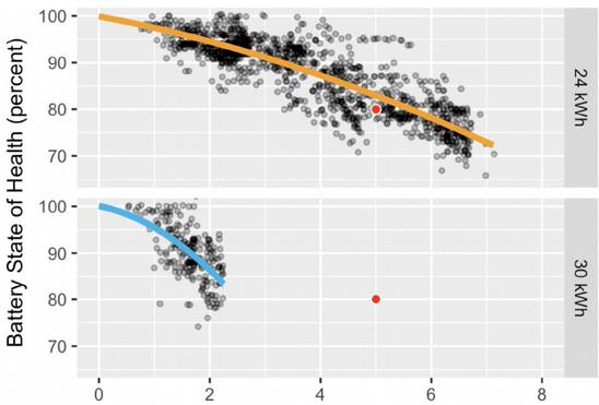 他(她)們將部分處于異常值(outlier)的蓄電池組剔除在外,然后將直流快充及每日的充電狀態(tài)等其他數(shù)據(jù)納入考量范圍,想找出電池衰減的原因及各因素間的關聯(lián)性。然而,目前還沒有跡象表明這類因素會對其數(shù)據(jù)造成重大影響。