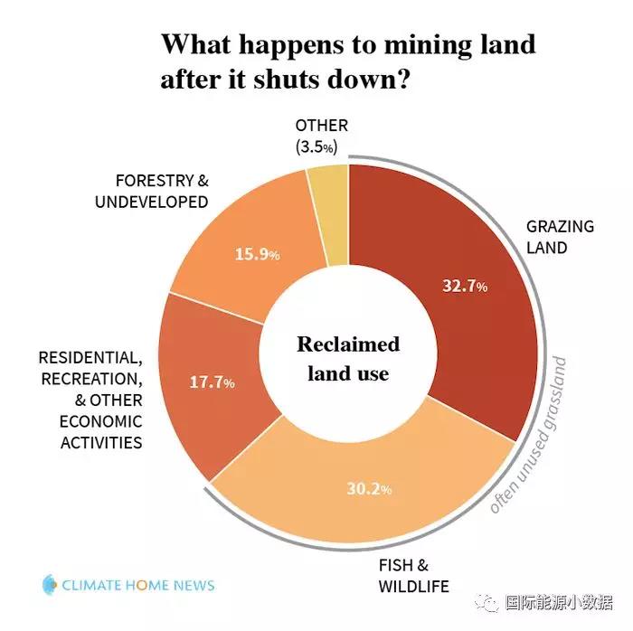 根據(jù)美國Climate Home News統(tǒng)計的數(shù)據(jù),32.7%的關閉的礦區(qū)面積沒有任何特殊的開發(fā)利用,基本上就是閑置讓它長草,成為牧場;30.2%成為魚塘或其他野生動物區(qū);17.7%改造為休閑、住宿、娛樂設施;15.9%成為林區(qū)或待開發(fā)。