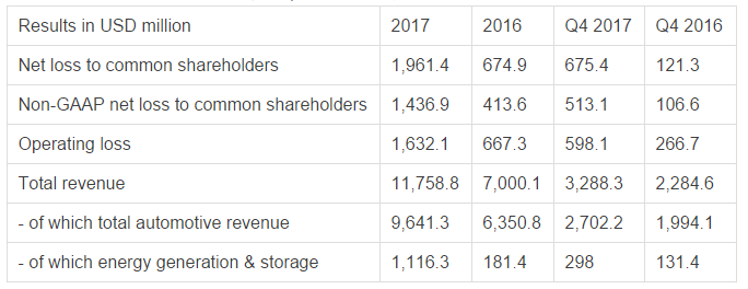 中國儲能網(wǎng)訊:特斯拉公司(Tesla Inc.)(納斯達(dá)克股票代碼:TSLA)2017年凈虧損額從2016年的6.749億美元擴(kuò)大至19.6億美元(合16億歐元),盡管同期營收大幅增長了68%。