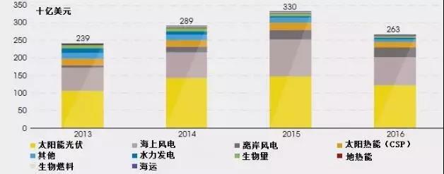 2013—2016年全球可再生能源不同技術(shù)類型的年度投資