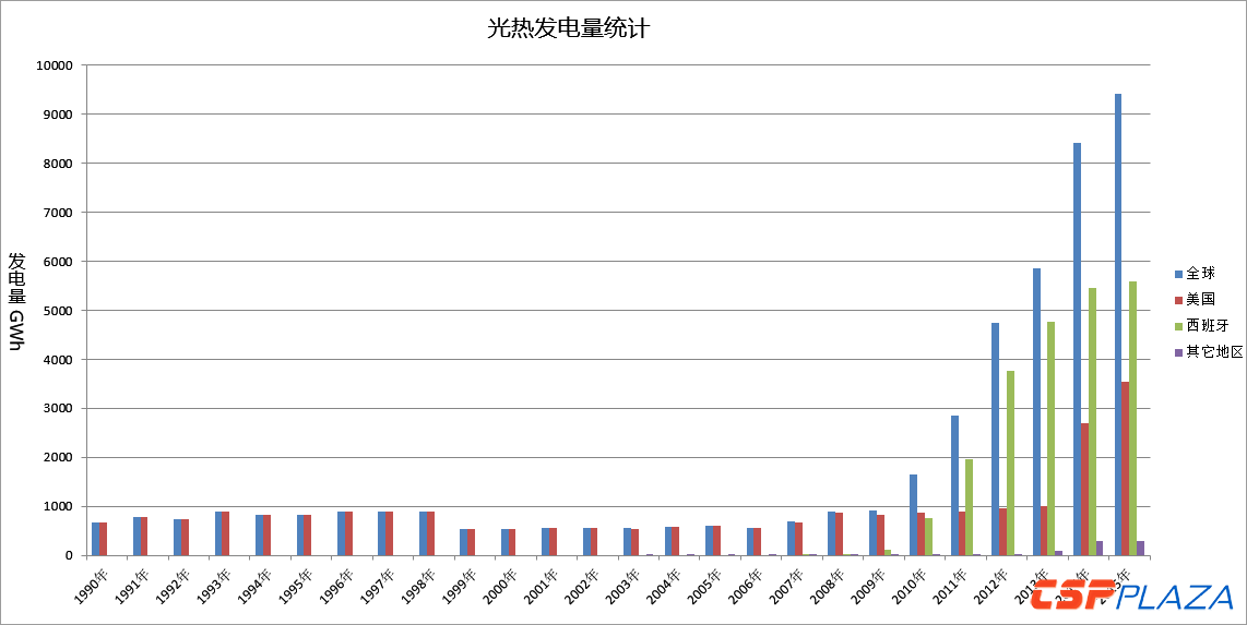 2015年,全球電力總發(fā)電量為24344520GWh,光熱發(fā)電的供電比例約為0.039%。從下面的全球光熱發(fā)電量統(tǒng)計(jì)柱狀圖可直觀反映,光熱發(fā)電的總發(fā)電量大致經(jīng)歷了1990~2008年的平穩(wěn)期、2009~2015年的成長(zhǎng)期兩個(gè)階段。