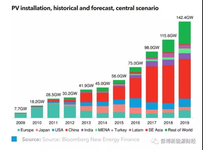 彭博新能源財經(jīng)對2018年總裝機量的預測(中等情景)