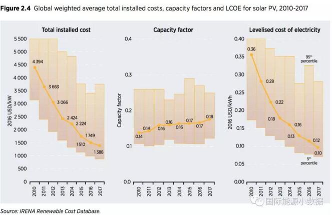 全球平均而言,2010年大型地面光伏發(fā)電平準(zhǔn)成本LCOE為0.36美元/千瓦時(shí),2017年LCOE為0.10美元/千瓦時(shí),7年間下降了72%。2010年的大型地面光伏裝機(jī)投資成本為4394美元/千瓦,2017年為1388美元/千瓦,7年間下降68%。2010年光伏發(fā)電站的容量系數(shù)平均為0.14,到2017年提高為0.18,7年間上升28%。