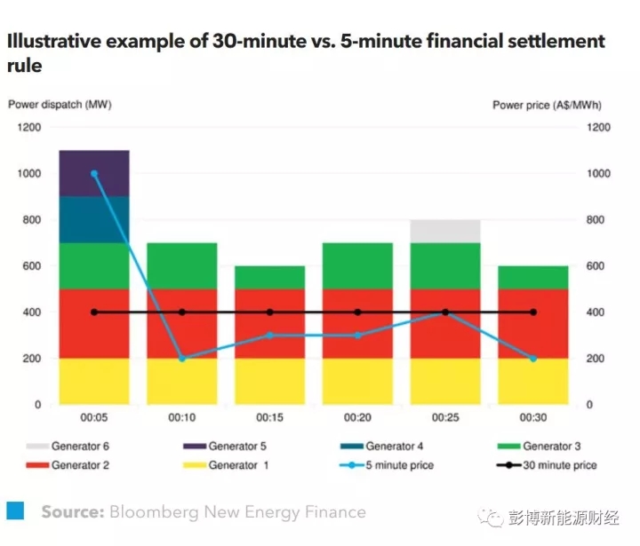 目前,澳大利亞電力系統(tǒng)的實(shí)際電力調(diào)度間隔為5分鐘,但財(cái)務(wù)結(jié)算間隔卻超過(guò)30分鐘,也就是說(shuō)發(fā)電機(jī)組獲得的實(shí)際費(fèi)用為“每30分鐘內(nèi)共6次調(diào)度的平均價(jià)格”(見(jiàn)上圖)。這種結(jié)算機(jī)制并不能有效區(qū)分真正的快速響應(yīng)和較慢的響應(yīng),導(dǎo)致一些在電網(wǎng)需求產(chǎn)生25分鐘后才開(kāi)始提供響應(yīng)電力的發(fā)電公司也可以拿到不合理的報(bào)酬。