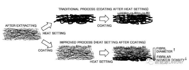 LG之所示這樣設(shè)計,是因為這種將熱處理后移的工藝,使得熱量必須通過涂層后才能到達(dá)基底隔膜,因此能夠在較高的溫度下對隔膜進(jìn)行處理,這一方面能夠提高涂層漿料對隔膜纖維的潤濕性,另一方面由于涂層的阻擋,因此在靠近涂層的位置隔膜纖維較細(xì),因此單位截面積內(nèi)的纖維數(shù)量較多,能夠與涂層形成更好的接觸,從而明顯的提高隔膜的機械和熱穩(wěn)定性,減少在高溫下的隔膜收縮。