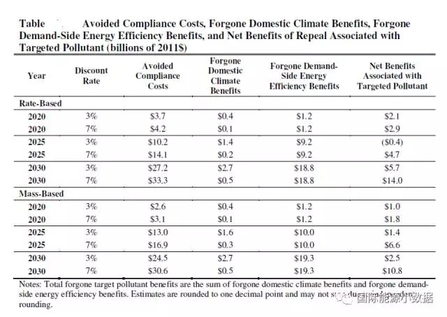 如下表所示,在污染物(包括二氧化碳)總量控制(mass based)目標(biāo)情境下,如果折現(xiàn)率為7%,那么執(zhí)行清潔電力計(jì)劃所帶來的美國本土排污收益損失為每年5億美元、需求側(cè)能效改善收益為193億美元,二者合計(jì)收益為198億美元;然而,執(zhí)行清潔電力計(jì)劃本身所需要的投資成本高達(dá)306億美元。這樣,把成本與收益相抵,取消清潔電力計(jì)劃還可以“節(jié)省”108億美元。即便在折現(xiàn)率為3%的假設(shè)下,那么取消清潔電力計(jì)劃仍有25億美元的凈“收益”。