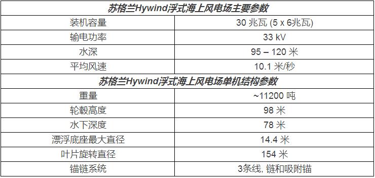 該風電場由5臺各6MW的風機組成,總容量為30MW,每座浮塔重達11200噸。風電場海域水深95-120米,離岸25公里。其他參數(shù)如下: