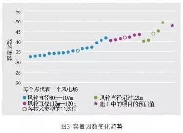 此外, 通過分析英國海上風電項目可以看出,容量因數(shù)(Capacity Factor) 呈現(xiàn)不斷上升的趨勢。圖3 顯示了在特定風輪直徑下,各種技術類型的容量因數(shù)。圖中并不是按照時間順序排列項目,而是列出了過去5 年中的平均值,每個點代表著一個風電場所達到的容量因數(shù)。從圖中可以看出,當風電機組的風輪直徑超過120m 后,平均容量因數(shù)接近44%(相當于利用小時數(shù)3854 小時),而通過在一些目前正處于建設階段的項目中應用新技術,容量因數(shù)將接近48%。這反映出英國海上風電技術、管理以及資產(chǎn)績效等方面的提升。