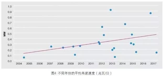 圖4 呈現(xiàn)的是從開工之初到最后一臺機組實現(xiàn)商業(yè)化運行期間的吊裝速度(兆瓦/ 日)。整體來看,它呈上升趨勢。在風電場規(guī)模和吊裝速度之間存在明顯的關聯(lián)性,項目規(guī)模越大,在簽訂合同和雇用安裝船時,就越容易從規(guī)模經(jīng)濟中受益。
