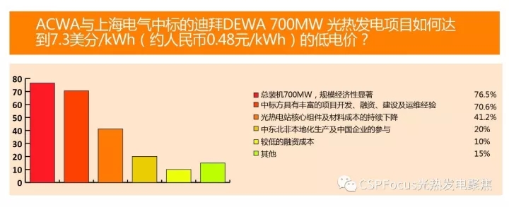 針對(duì)本次迪拜700MW光熱電站如何投出如此低的電價(jià)水平,CSP Focus對(duì)剛剛參與了CSP Focus光熱發(fā)電中東北非聚焦大會(huì)的代表進(jìn)行了調(diào)研。綜合來(lái)看,如此低的中標(biāo)價(jià)格得益于該項(xiàng)目的規(guī)模效應(yīng)、較低的融資成本、中標(biāo)方豐富的經(jīng)驗(yàn)、電站成本的持續(xù)下降、生產(chǎn)本地化、中國(guó)元素的注入等因素。(詳見(jiàn)下圖,點(diǎn)擊放大)