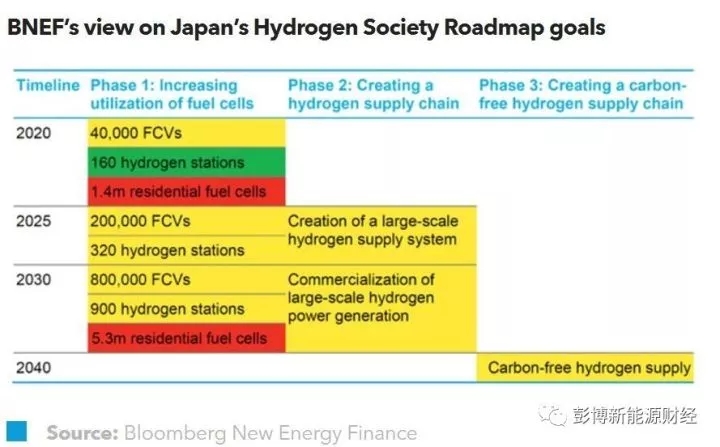 具體來看,日本的“氫氣社會發(fā)展路線圖”共有三個主要發(fā)展方向,分別為居民住宅燃料電池;燃料電池汽車及相應(yīng)加氫基礎(chǔ)設(shè)施;以及無碳化全球氫能供應(yīng)鏈。在“線路圖”中,日本政府已經(jīng)為該國住宅燃料電池和燃料電池汽車的發(fā)展制定了具體的2020、2025 和 2030 年分階段目標;并為氫能供應(yīng)鏈的建設(shè)制定了2040 年的定性目標。