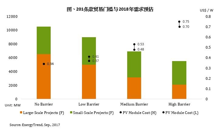 由于海外進口之低價組件主要供應美國的大型地面電站,貿易門檻之高低也將直接沖擊大型電站的需求。一旦美國決定對海外太陽能組件采取高門檻,組件成本將隨之飆高,預計美國2018年的市場需求將大幅下跌到5.5GW左右。后續(xù)須待2019年貿易門檻修正、美國本土產能陸續(xù)開出后才會逐漸回溫。