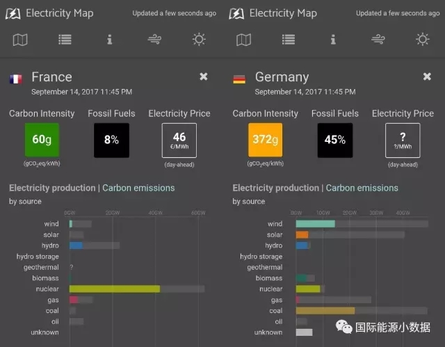 中國(guó)儲(chǔ)能網(wǎng)訊:根據(jù)electricityma.ogp的實(shí)時(shí)顯示,在2017年9月14日當(dāng)?shù)貢r(shí)間11:45,德國(guó)的風(fēng)電光伏的發(fā)電量大約是法國(guó)的6倍,然而每發(fā)1千瓦時(shí)電德國(guó)的碳排放為372克,法國(guó)為60克,德國(guó)的發(fā)電碳強(qiáng)度也正好是法國(guó)的6倍。原因很簡(jiǎn)單:此時(shí)德國(guó)還有45%的化石燃料發(fā)電(主要是煤電),而法國(guó)的化石能源發(fā)電僅占8%。
