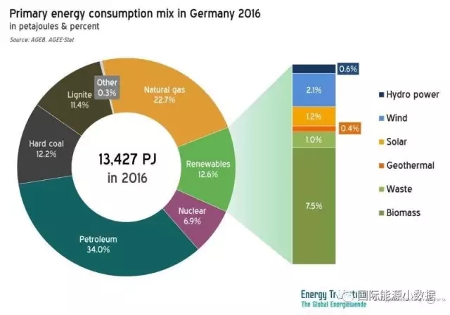 如果從一次能源消費(fèi)的角度來(lái)看,2016年德國(guó)的石油消費(fèi)占34%、煤炭占23.6%、天然氣占22.7%、核能占6.9%,各類(lèi)可再生能源及其它占12.9%(生物質(zhì)7.5%、風(fēng)電2.1%、太陽(yáng)能1.2%、垃圾1.0%、水電0.6%、地?zé)?.4%)??傮w而言,化石能源仍占德國(guó)一次能源消費(fèi)的80.3%。