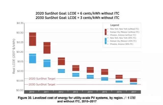這樣,美國公共事業(yè)級光伏電站已經(jīng)基本實現(xiàn)能源部2011年為2020年設定的成本下行目標(Sunshot Goal):度電平準成本6美分/千瓦時、系統(tǒng)投資成本1美元/瓦。