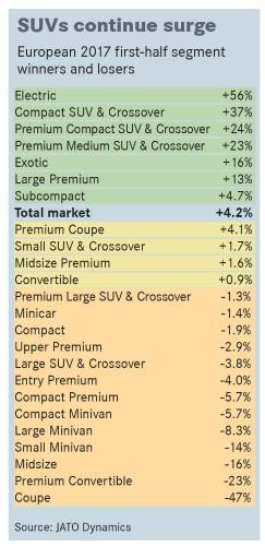 今年上半年,歐洲車市增長第二快的板塊則是緊湊型SUV以及跨界車,增速高達(dá)37%,達(dá)到了989421輛。其中,全新的標(biāo)致3008極大的促進(jìn)了板塊銷量增長,今年上半年,標(biāo)致3008的總銷量超過了8.1萬輛,并成為板塊內(nèi)排名第三的品牌,第一為日產(chǎn)Qashqai(136480輛),第二為大眾Tiguan(128033輛)。