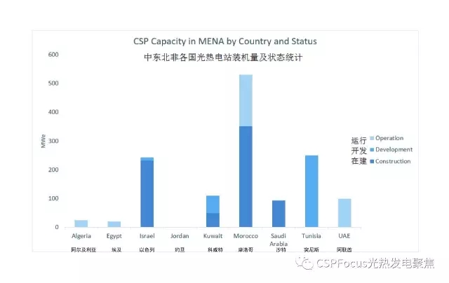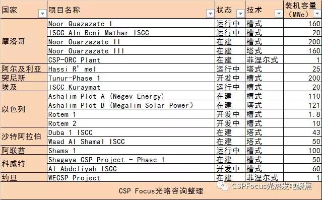 中國(guó)儲(chǔ)能網(wǎng)訊:作為全球光熱發(fā)電重要市場(chǎng)之一,中東北非(MENA)地區(qū)多個(gè)國(guó)家均積極參與到光熱電站的開(kāi)發(fā)和建設(shè)當(dāng)中。這些國(guó)家包括摩洛哥、阿聯(lián)酋、沙特、突尼斯、以色列、科威特、阿爾及利亞、埃及、約旦九國(guó)。其中摩洛哥已建成項(xiàng)目?jī)蓚€(gè)、在建項(xiàng)目三個(gè),共計(jì)541MW位位居總裝機(jī)量第一。