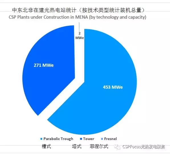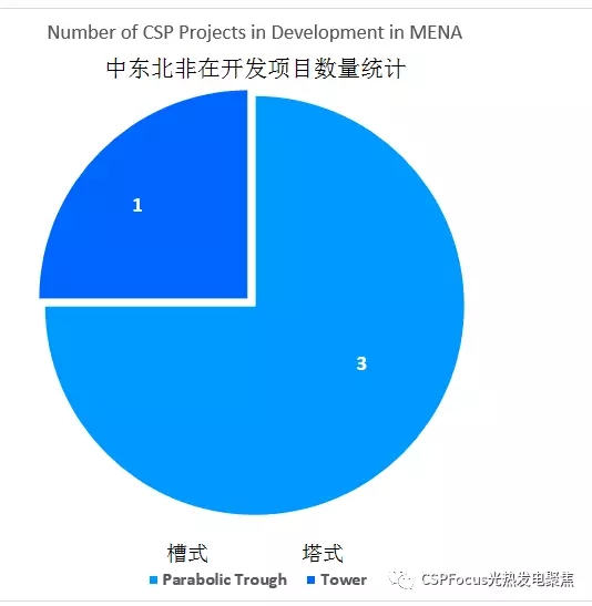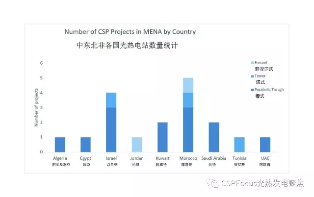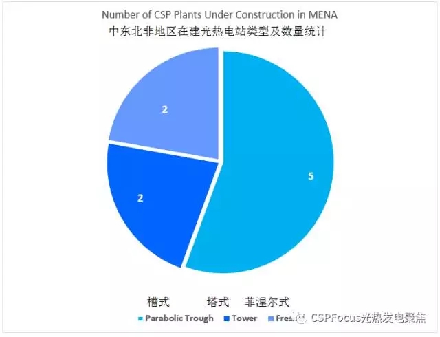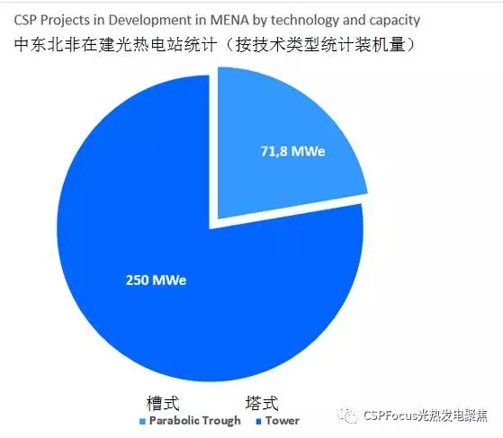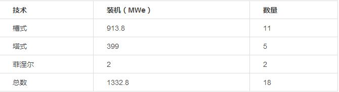 目前MENA地區(qū)擁有光熱項(xiàng)目總數(shù)為18個(gè),合計(jì)裝機(jī)量為1332.8 MWe。從技術(shù)類(lèi)型上來(lái)看,槽式占大部分,菲涅爾式為試驗(yàn)性小型電站。