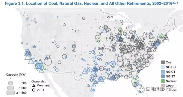 首先,到底是哪些、什么樣的煤電廠關(guān)閉了呢?研究報告指出,2002年到2016年間美國共有531座煤電廠關(guān)閉(大約59吉瓦),特別是2015年在各種退役的電廠中有80%是煤電廠。已經(jīng)關(guān)閉的以及預(yù)計關(guān)閉的煤電廠有以下特點: