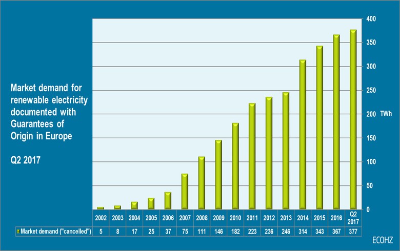 中國儲能網(wǎng)訊:根據(jù)歐洲發(fā)行機構(gòu)協(xié)會的數(shù)據(jù),2017年二季度,歐洲綠色電力需求同比激增39%。