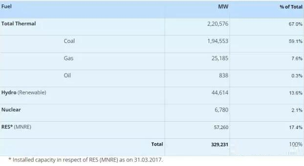 中國儲能網(wǎng)訊:根據(jù)電力部最新發(fā)布的數(shù)據(jù),到2017年6月30日止,印度發(fā)電總裝機達(dá)到329.231吉瓦,其中煤電裝機占59.1%、天然氣7.6%、大型水電13.6%、核電2.1%,其他可再生能源(包括小水電、生物質(zhì)發(fā)電、城鄉(xiāng)垃圾發(fā)電、太陽能、風(fēng)能)占比17.4%。