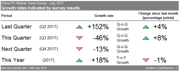 該報(bào)告分析認(rèn)為,發(fā)改委能源局公布2017年上半年整體裝機(jī)達(dá)24Gw,調(diào)研參與者提供的趨勢(shì)同發(fā)改委能源局公布的新聞口徑一致;三季度雖然會(huì)走弱,但絕對(duì)值預(yù)期卻在走強(qiáng)。主要原因是訂單充足以及二季度未完成項(xiàng)目延期到三季度。約5GW領(lǐng)跑者項(xiàng)目最早將于三季度末完成裝機(jī),甚至有部分項(xiàng)目會(huì)推遲到四季度末完成;政府扶持方式面臨重大改變。105GW的十三五光伏發(fā)展規(guī)劃裝機(jī)目標(biāo)會(huì)上調(diào)至150GW。補(bǔ)貼方式可能會(huì)由純撥款型補(bǔ)貼逐步轉(zhuǎn)向市場(chǎng)引導(dǎo)式;四季度裝機(jī)情況不被看好,因?yàn)椴淮_定性太高。超出預(yù)期的上半年裝機(jī)給并網(wǎng)及財(cái)政補(bǔ)貼帶來(lái)了空前壓力,年底政策上下行均有可能,最終取決于高層部門同光伏行業(yè)從業(yè)者的博弈結(jié)果。