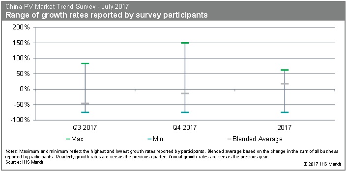 中國(guó)儲(chǔ)能網(wǎng)訊:IHS Markit最新的七月版《中國(guó)光伏市場(chǎng)趨勢(shì)調(diào)研》報(bào)告結(jié)果日前出爐,該報(bào)告顯示, 七月調(diào)研結(jié)果發(fā)現(xiàn),二季度出貨/裝機(jī)量相比上月調(diào)研結(jié)果更有4%提升,季度環(huán)比增量達(dá)152%; 大多數(shù)調(diào)研參與者表示三季度出貨量/裝機(jī)量會(huì)顯著下降。然而,總體來(lái)講,三季度的預(yù)期較上月調(diào)研結(jié)果提高了8個(gè)百分點(diǎn),相比二季度,三季度降幅為46%;調(diào)研結(jié)果顯示,因?yàn)槲磥?lái)政策走向不明,四季度走勢(shì)偏弱。平均來(lái)看,本年度最后一個(gè)季度環(huán)比降幅達(dá)13%。