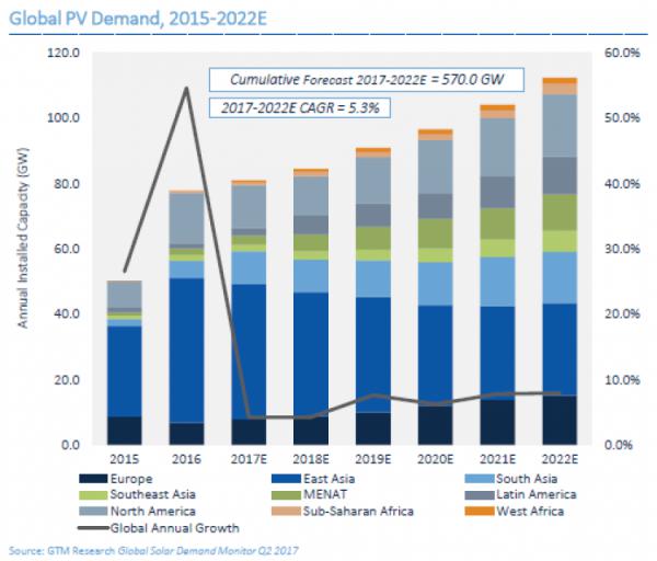 4月,GTM已預(yù)測2017年全球太陽能需求有望高達(dá)85吉瓦,但是在最新的報告中將上述數(shù)據(jù)下調(diào)至84.1吉瓦。