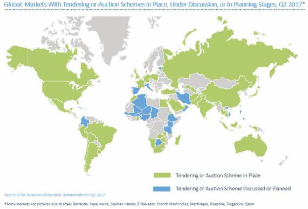 隨著更多國家采取拍賣機(jī)制來分配容量并降低關(guān)稅,而且通常不需要提供補(bǔ)貼,拍賣的數(shù)量預(yù)計繼續(xù)擴(kuò)張。已經(jīng)有48個國家采取拍賣策略,另外有27個市場正考慮或計劃這樣的政策。