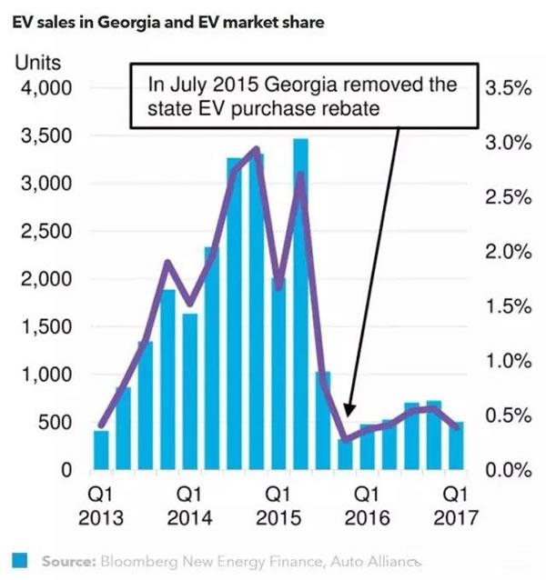 中國儲能網(wǎng)訊:美國電動汽車市場受一系列優(yōu)惠政策驅(qū)動,其中包括2010年開始的每車7500美元的聯(lián)邦稅收抵免。另外還有幾個州也推出了購置電動汽車的優(yōu)惠政策。在佐治亞州,從1997年開始即推出了每輛電動車5000美元的購置稅退稅政策。州政府的激勵政策,極大推動了電動汽車的銷售,到2014年第四季度,佐治亞州的新車銷售中有3%是電動車,達到電動汽車銷售的巔峰。然而2015年7月退稅政策終止,導致佐治亞州電動汽車銷售直線下滑。