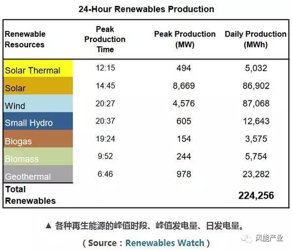 在各種再生能源中,峰值發(fā)電量以太陽能居冠,達(dá)8,669百萬瓦,風(fēng)力發(fā)電則以4,576百萬瓦次之。在日發(fā)電量方面,風(fēng)力發(fā)電可產(chǎn)出87,068兆瓦/時(shí)的電量,而太陽能發(fā)電則為86,902兆瓦/時(shí)。