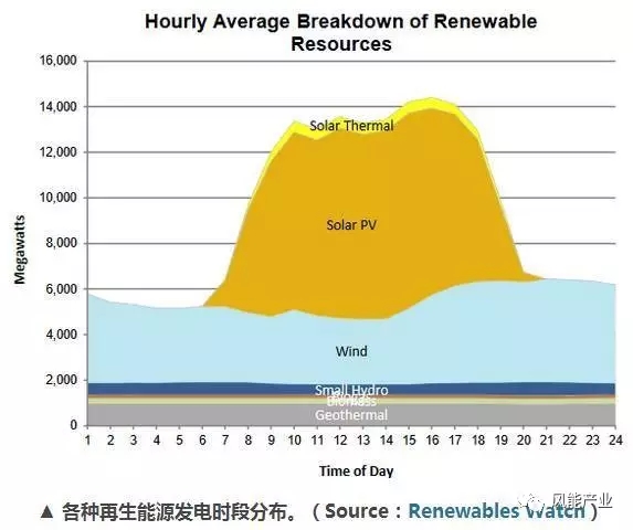 太陽能發(fā)電主要集中在正午12點(diǎn)的前后5個(gè)小時(shí),而風(fēng)力發(fā)電、小型水力發(fā)電、沼氣發(fā)電、生物質(zhì)能以及地?zé)岚l(fā)電則相對(duì)平均分布在一天當(dāng)中。